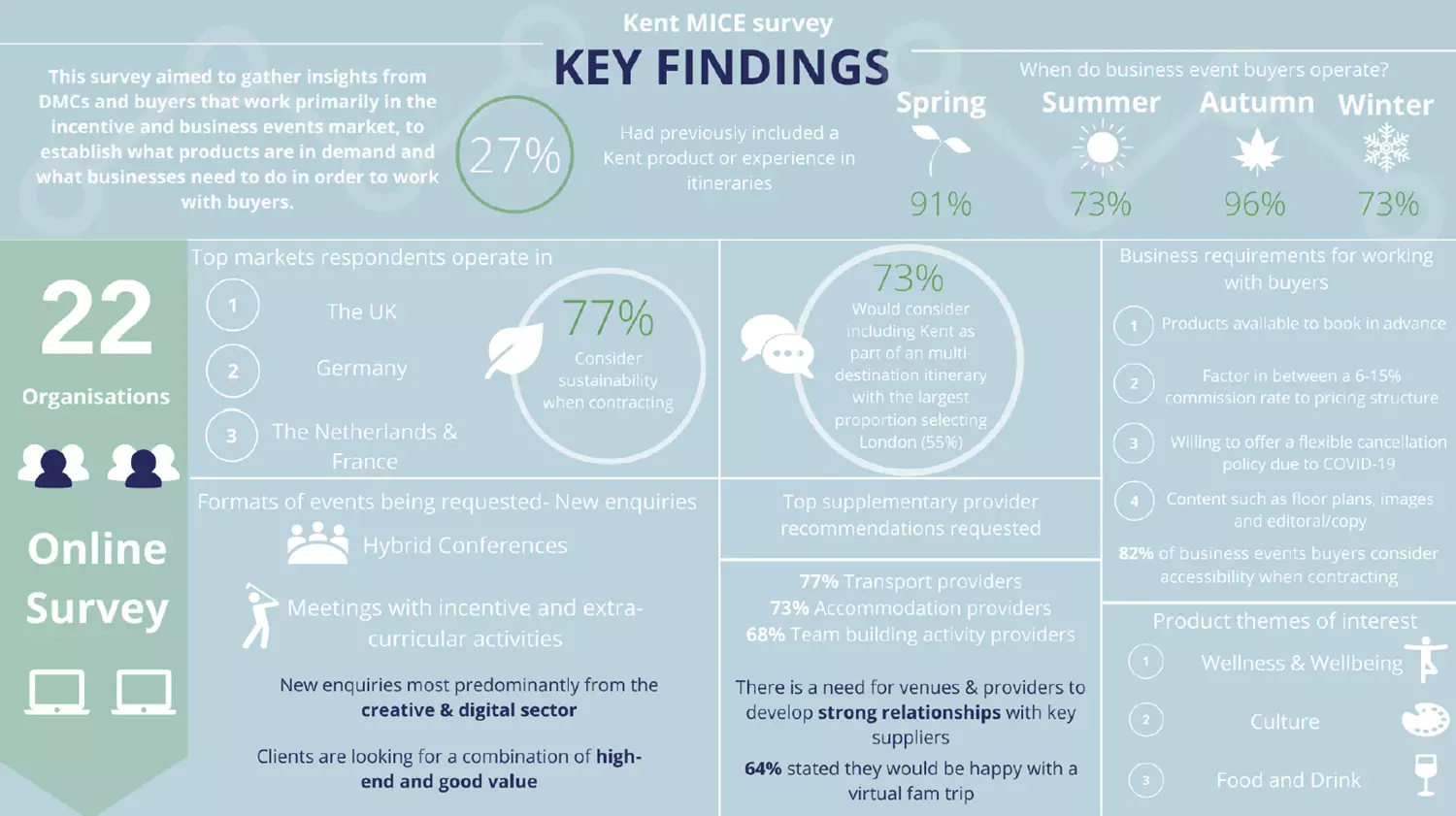 In 2020, Visit Kent conducted a survey gathering insights from Destination Management Companies (DMCs) and buyers that work primarily in the incentive and business events market. The survey aimed to establish what products are in demand and what businesses need to do in order to work with buyers and provide support in driving demand for Kent.